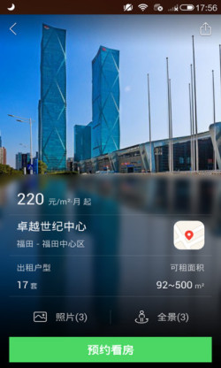点点租安排办公体验师,深入体验每套办公房源,并安排专业摄影师,拍摄专业实景图、及360度室内全景图。致力于为用户呈现详细、完美的室内细节,让线上虚拟看房,从此成为现实!新增地图找房、一键预约看房、主题精选房源等功能,给用户更好的找房体验!通过室内全景,街景、地图等,即可查看写字楼详情及周边,足不出户即可了解楼盘及房源信息。